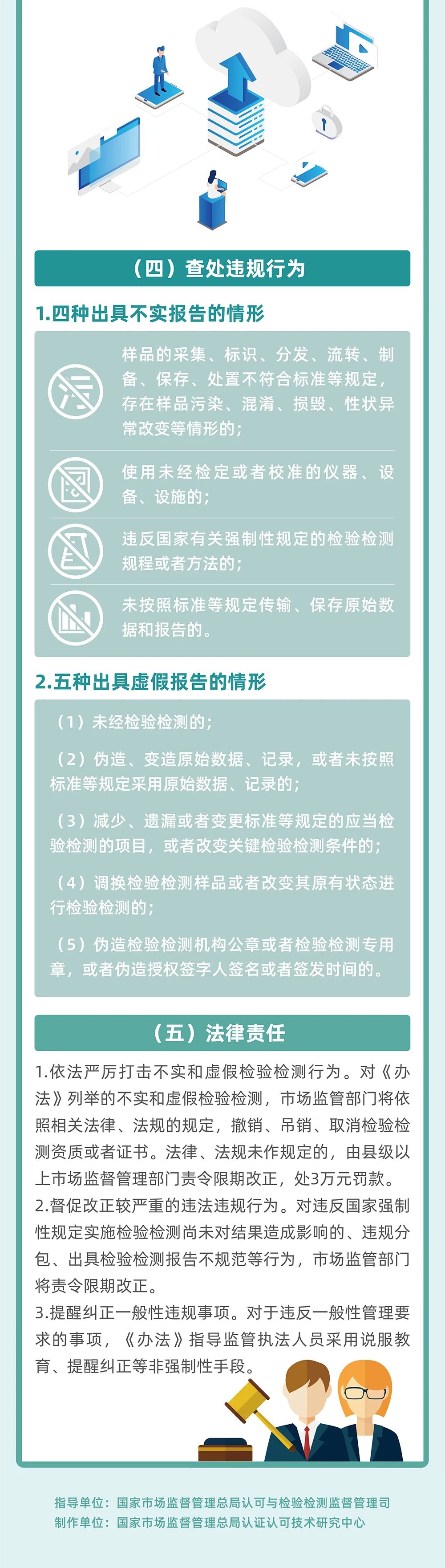 (五)关于违法违规法律责任。对于检验验收机构违反义务性规定的情形,《办法》区分风险、危害程度,采取了不同的行政管理方式。一是依法严厉打击不实和虚假检验验收行为。强调对《办法》列举的不实和虚假检验验收,市场监管部门要严格按照《产品质量法》《食品安全法》《道路交通安全法》《大气污染防治法》《农产品质量安全法》《护理器械监督管理条例》《化妆品监督管理条例》等实施吊销资质或证书等行政处罚。二是督促改正较严重的违法违规行为。《办法》仅对可能损害检验验收活动委托方或不特定第三方权益、较易引发争议的一般违法行为设置处理处罚规定,包括违反国家强制性规定实施检验验收尚未对结果造成影响的、违规分包、出具检验验收报告不规范等。三是提醒纠正一般性违规事项。对于违反一般性管理要求的事项,指导监管执法人员采用《办法》第二十四条规定的“说服教育、提醒纠正等非强制性手段”。