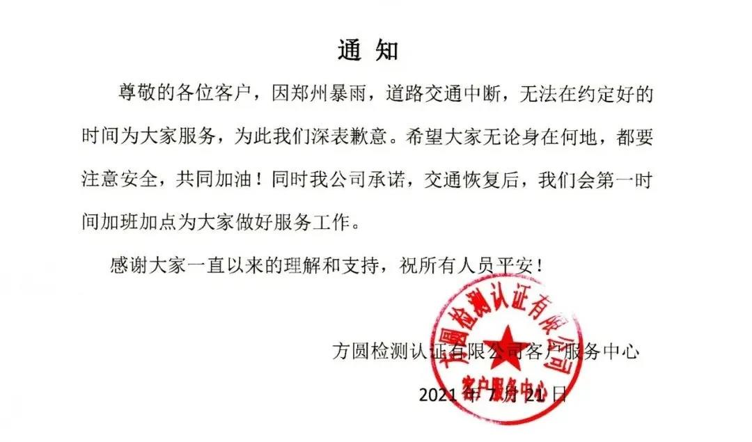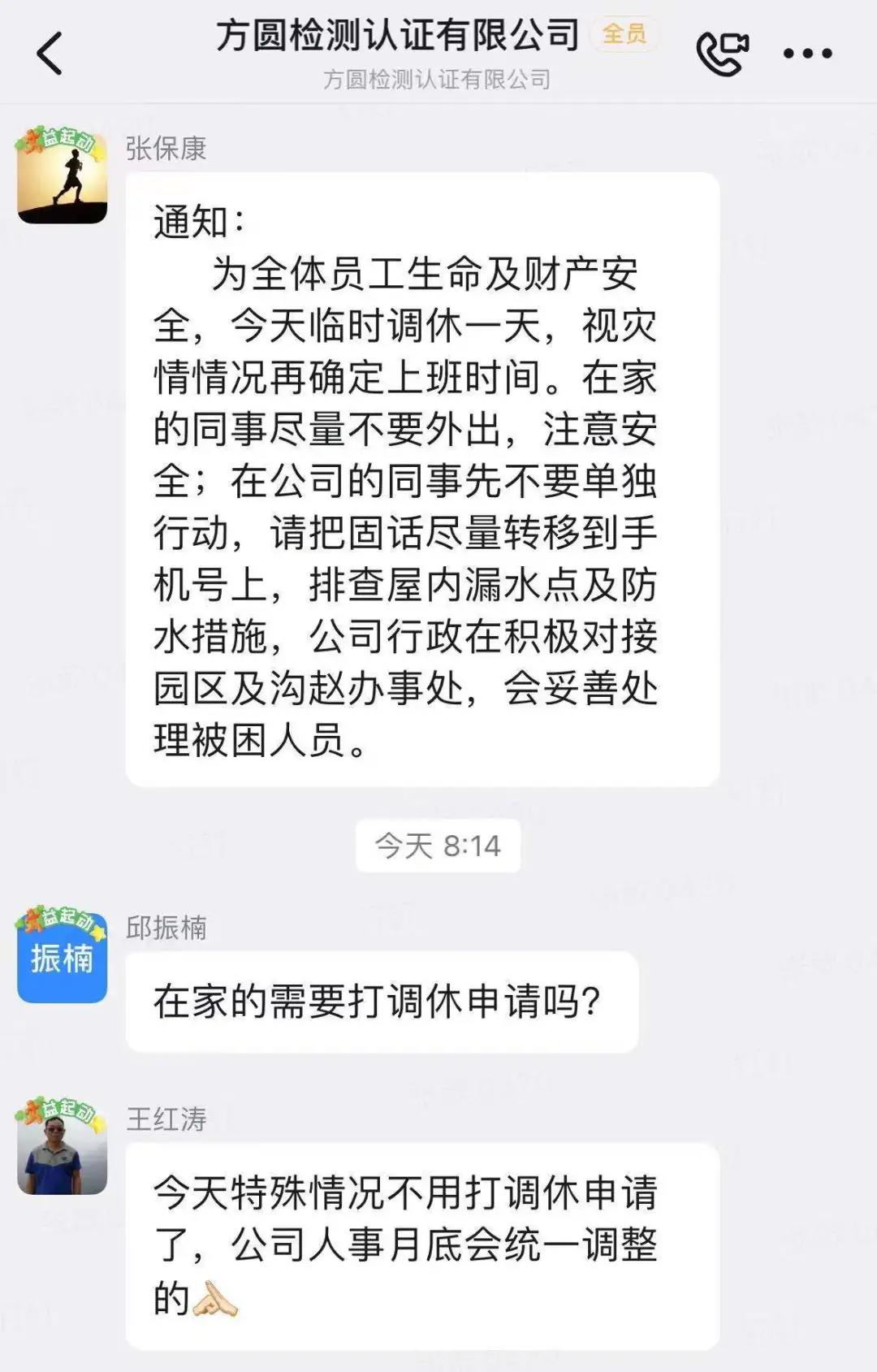 7月21日,因连日大雨,暴雨灾害仍未解除,为确保员工生命及财产安全,公司决定给予全体员工调休一天,积极协助滞留员工返家。因暴雨灾害造成公司业务无法正常开展,公司及时颁发通知,并及时与客户沟通协调,妥善处理工作事宜。