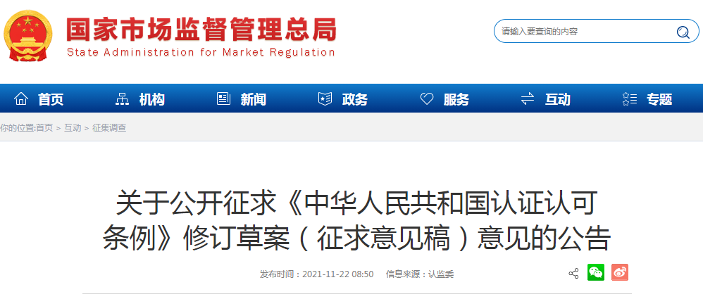 关于公开征求《中华人民共和国认证认可条例》修订草案(征求意见稿)意见的公告