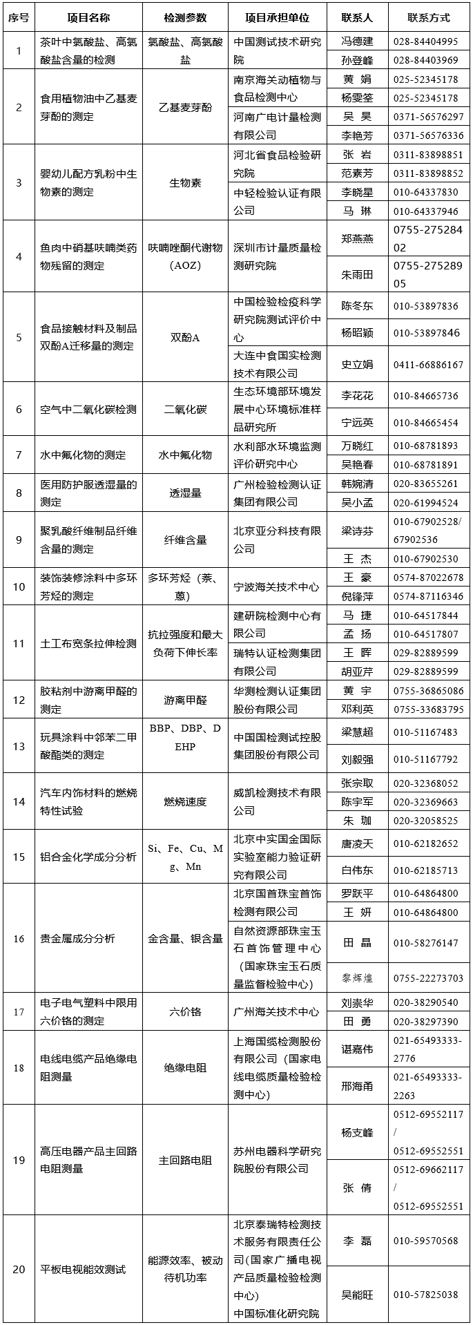 2022年国家级能力验证计划共20项。其中,涉及食品安全5项,消费品安全3项,电气安全3项,建筑质量3项,材料测试3项,生态环境监测2项,护理防护用品1项(相关项目和承担单位信息见附件)。