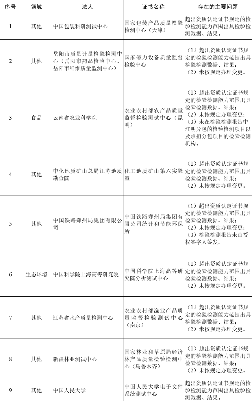 (二)责令存在超出资质认定证书规定的检验验收能力范围出具检验验收数据、结果等问题的9家机构限期改正,并移交属地市场监管部门实施行政罚款。