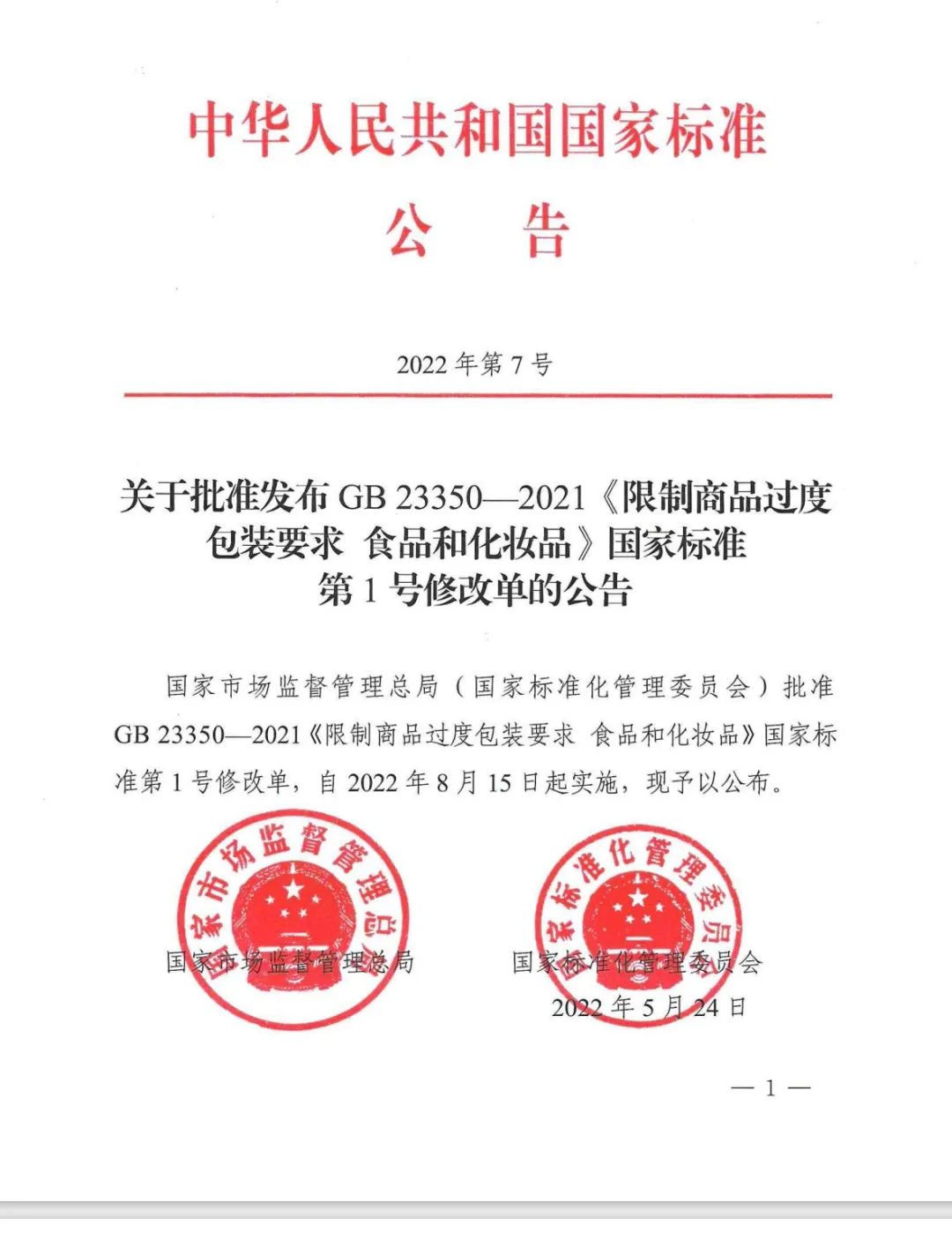 近日,国家市场监督管理总局对GB 23350——2021《限制商品过度包装要求食品和化妆品》国家标准第1号修改单予以公布。