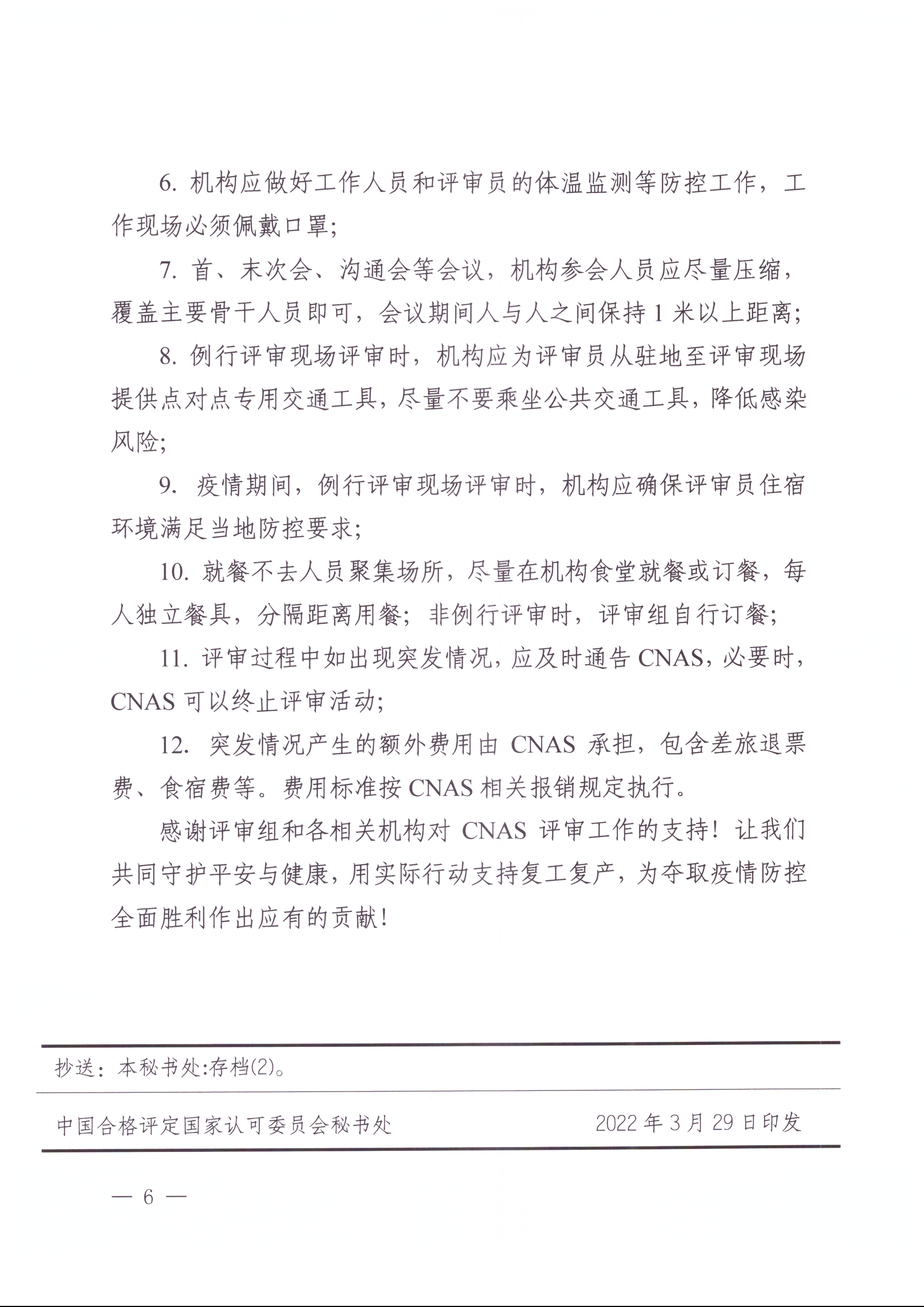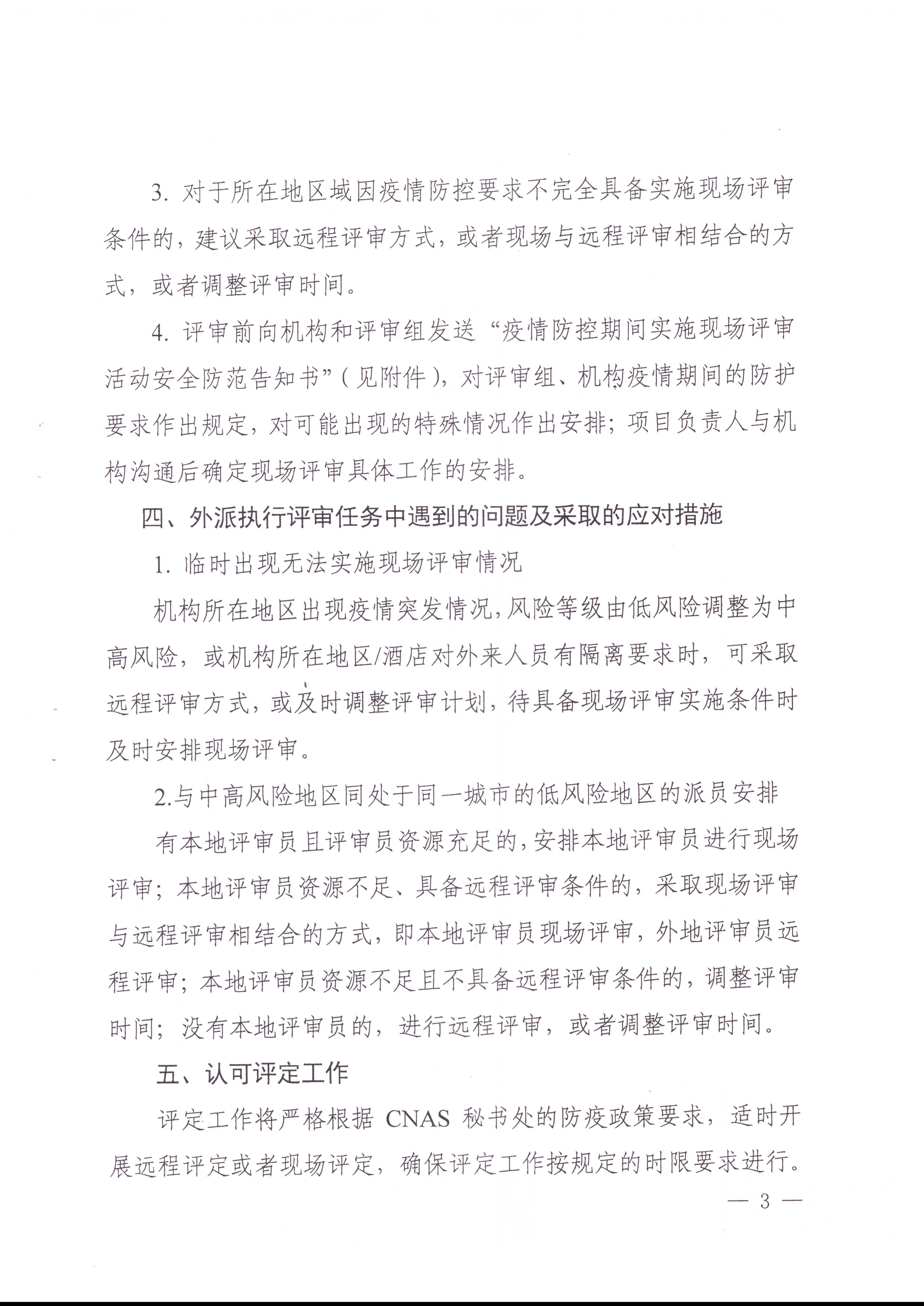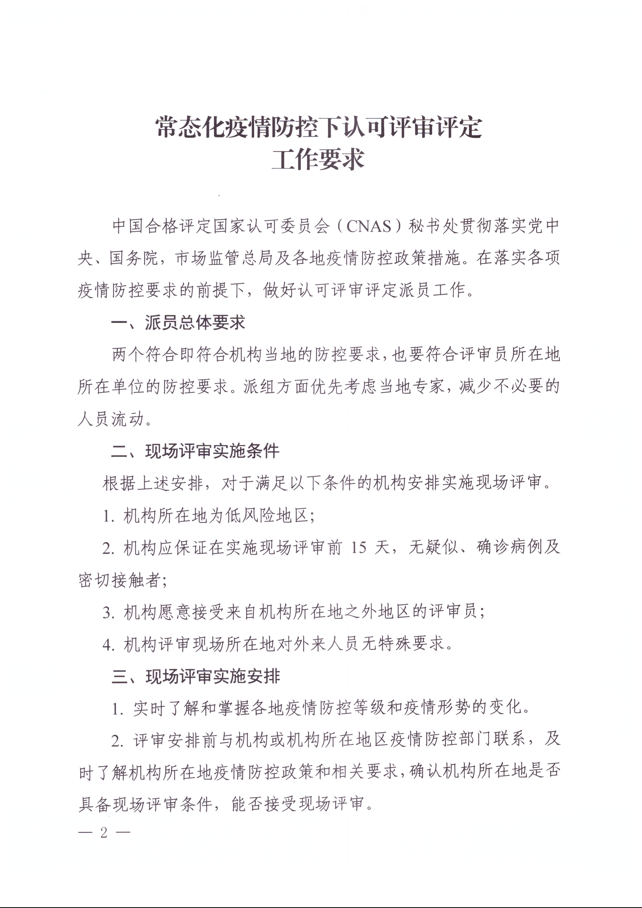 近日,中国合格评定国家认可委员会印发《常态化疫情防控下认可评审评定工作要求》,要求在落实各项疫情防控要求的前提下,做好认可评审评定派员工作。文件对认可评审评定派员总体要求、现场评审实施条件、现场评审实施安排、外派执行评审任务中遇到的问题及采取的应对措施、疫情期间外出评审发生额外费用报销规定做出了说明。具体内容如下: